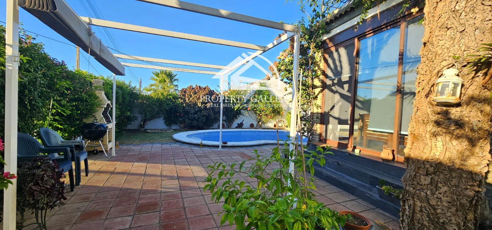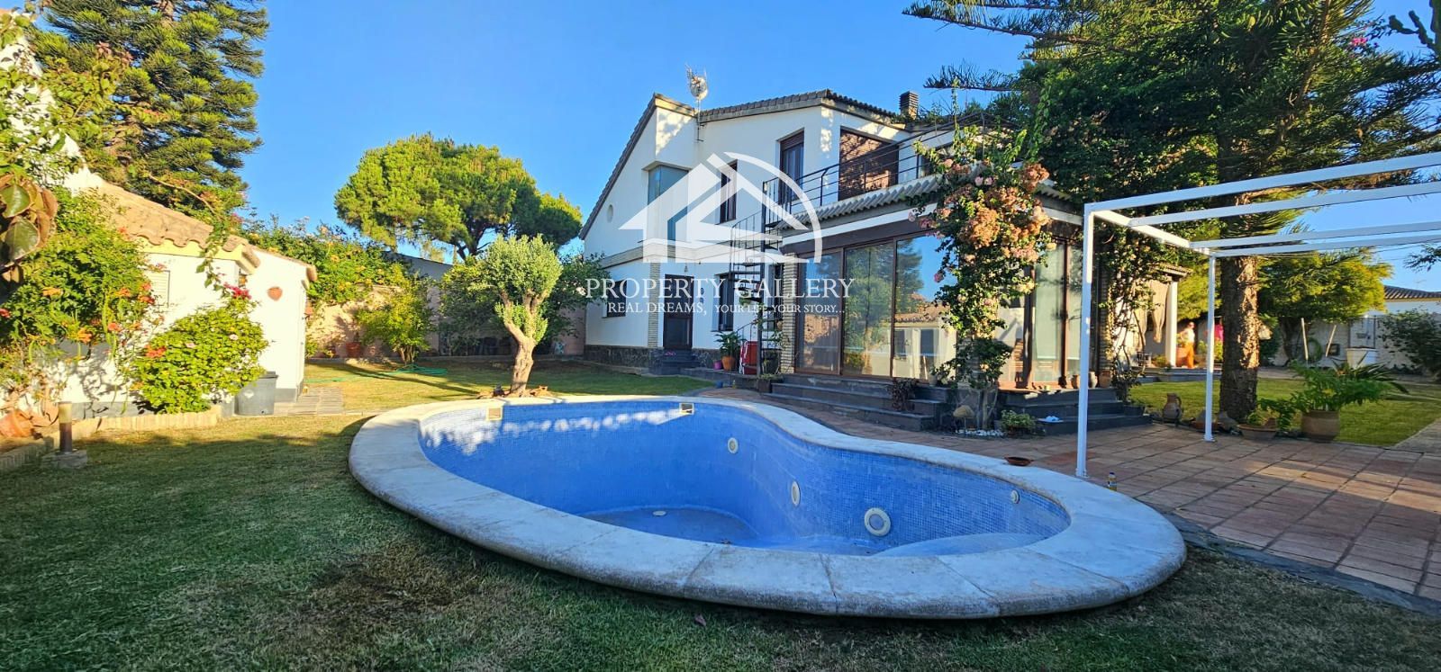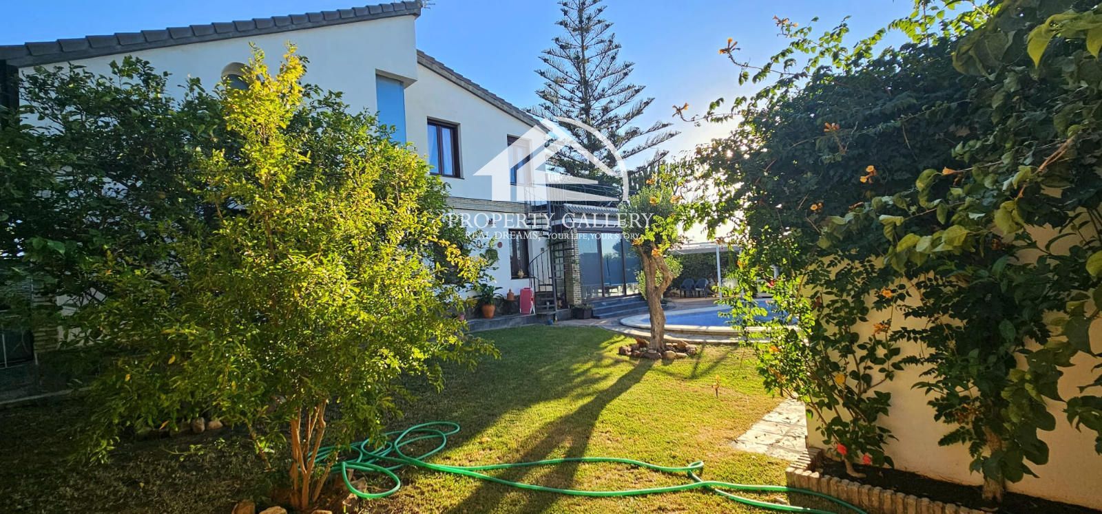 En el exterior cuenta con una magnifica piscina en forma de riñón, cuarto de máquinas y baño exterior con ducha, zona de barbacoa y carpa de verano con zonas verdes con riego automático.