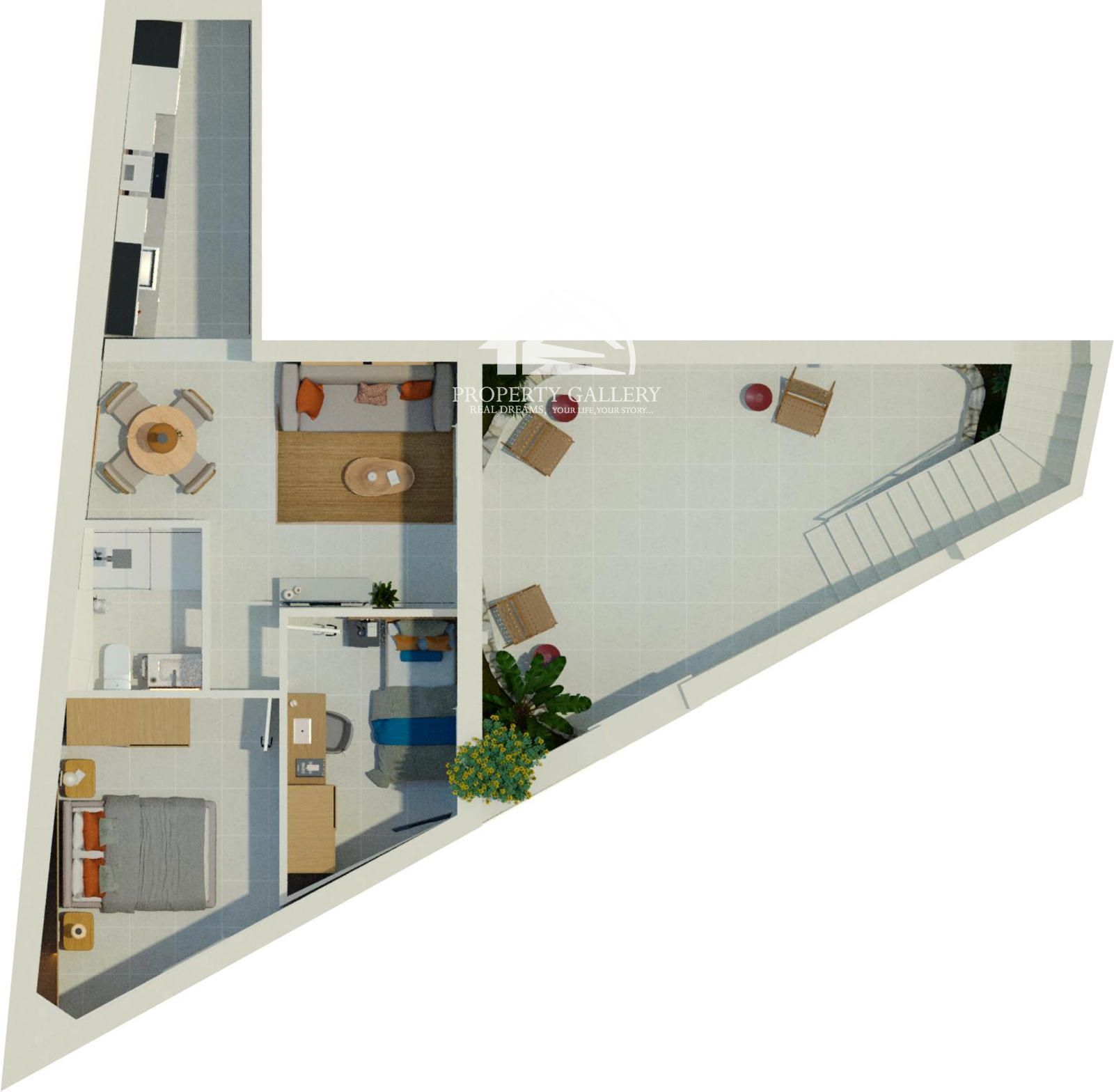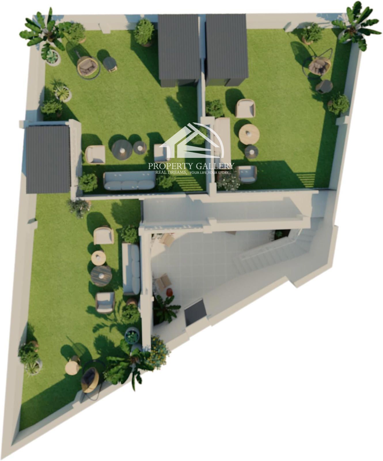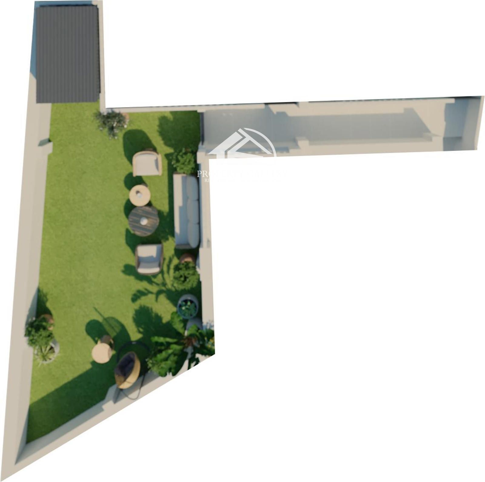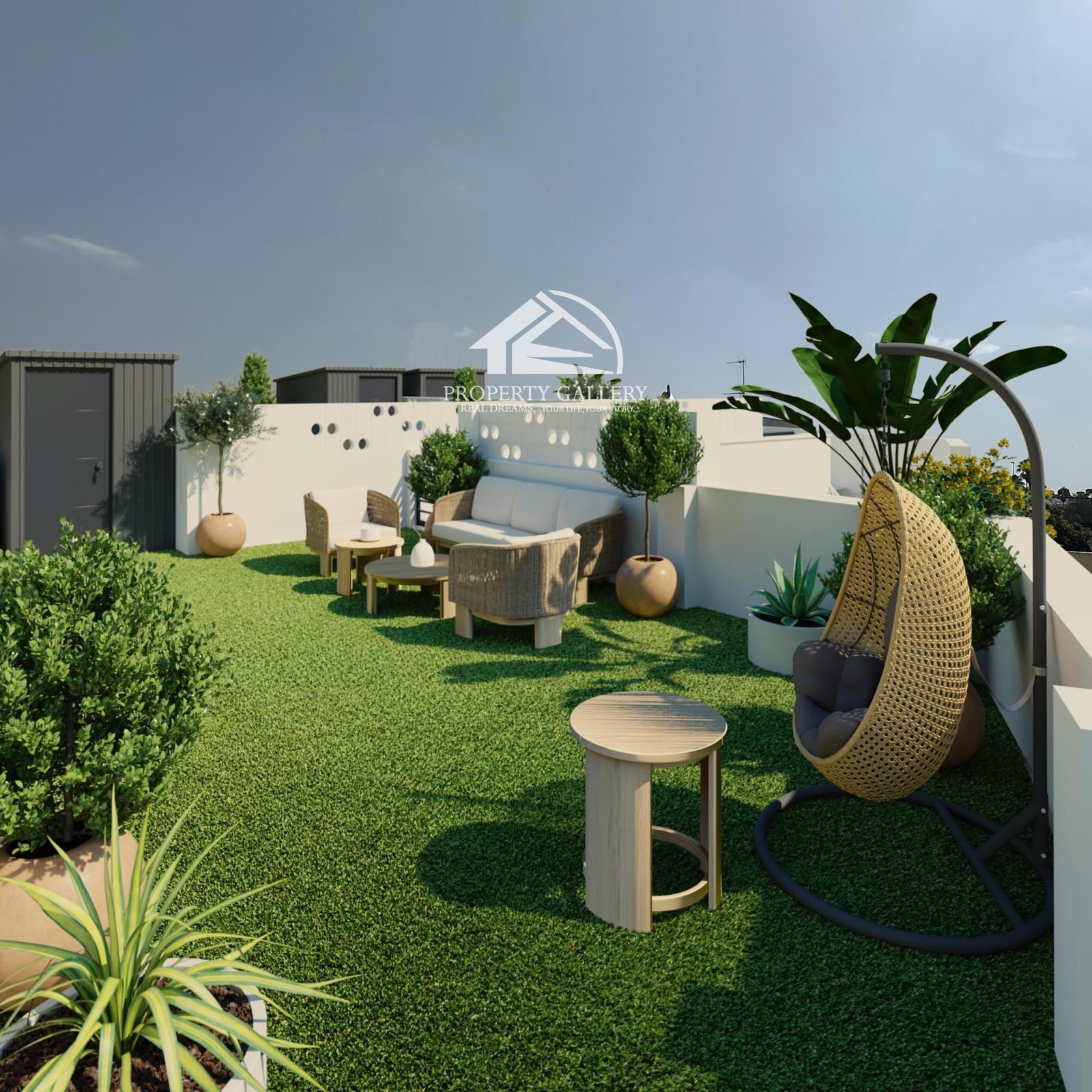 La terraza se entrega con césped artificial y divisiones instaladas, sin mobiliario.